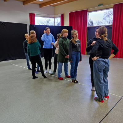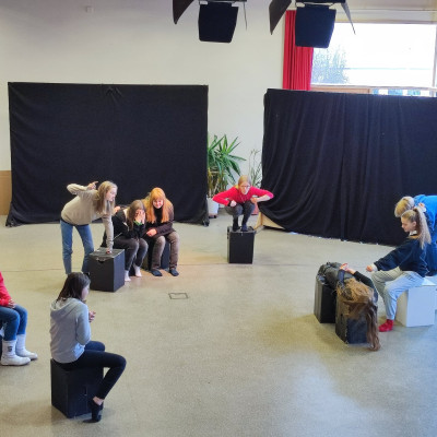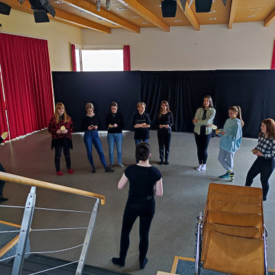 Frau Falk unterrichtet den Kurs "Darstellen und Gestalten". Hier entstehen einige kleinere und größere Theaterprojekte.